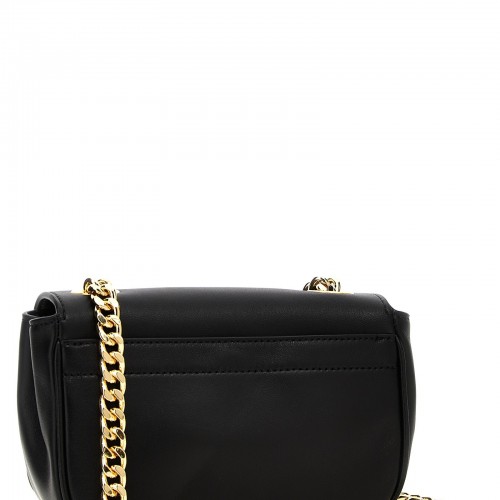 Leather shoulder bag, magnetic flap closure, front metal lettering logo, chain handle, back pocket.
