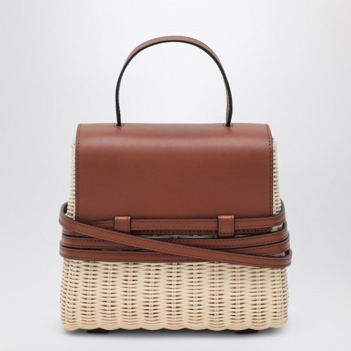Small hand bag by Moschino in raffia and brown leather, characterized by a top handle, strap detail with adjustable multi-turn buckle, front flap with magnetic closure, single compartment and internal zip pocket.