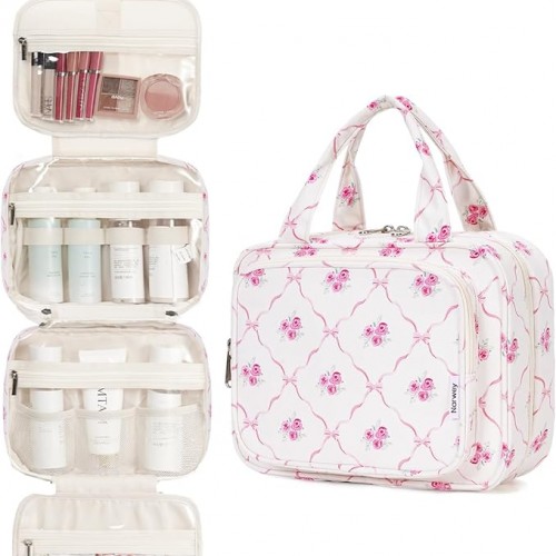 Narwey Hanging Toiletry Bag for Women Travel Makeup Bag Organizer Toiletries Bag for Travel Size Essentials Accessories Cosmetics (Bowknot and Flower (Medium))