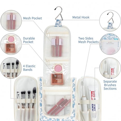 Narwey Hanging Toiletry Bag Women Travel Makeup Bag Organizer Toiletries Bag for Travel Size Essentials Accessories Cosmetics (Medium,Little Blue Flower)