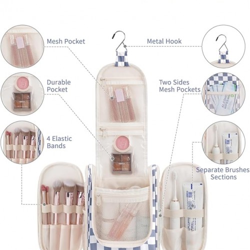 - DETAILS ORIENTED – Buit-in large metal hook allows hanging the toiletry case from towel rack, coat hook or whereever is available, making your toiletries and cosmetics displayed well for easy access, saving bathroom counter space as well. Water-resistent and durable fabric protects your gear from spills. Soft fabric and reliable zippers. Wide opening and rectangle shape makes it easy to stand on its own