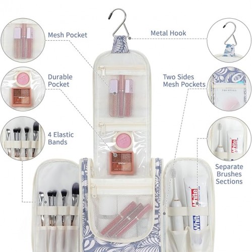 - DETAILS ORIENTED – Buit-in large metal hook allows hanging the toiletry case from towel rack, coat hook or whereever is available, making your toiletries and cosmetics displayed well for easy access, saving bathroom counter space as well. Water-resistent and durable fabric protects your gear from spills. Soft fabric and reliable zippers. Wide opening and rectangle shape makes it easy to stand on its own