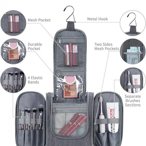 - DETAILS ORIENTED – Buit-in large metal hook allows hanging the toiletry case from towel rack, coat hook or whereever is available, making your toiletries and cosmetics displayed well for easy access, saving bathroom counter space as well. Water-resistent and durable fabric protects your gear from spills. Soft fabric and reliable zippers. Wide opening and rectangle shape makes it easy to stand on its own