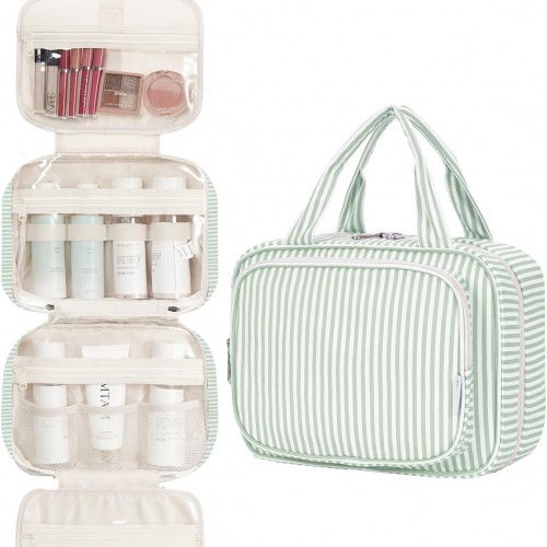 Narwey Striped Hanging Toiletry Bag for Women Travel Makeup Bag Organizer Toiletries Bag for Travel Size Essentials Accessories Cosmetics (Mint Green Stripe (Medium))