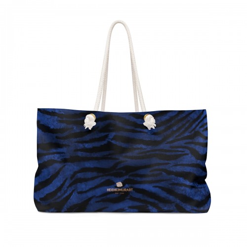 This is a fashionable black and navy blue tiger striped print large size oversized women’s weekend yoga bag or use this weekender bag when you are traveling back home and school/ work with your necessities. This navy blue tiger striped print weekender tote bag fits your yoga towel and yoga mat perfectly. You can wear this large size weekender bag with ease and put all your daily women’s essentials into this weekender bag. Made and Designed in the USA. Designed in Spokane, WA and then shipped from North Carolina to your destination. We offer international shipping just for you.