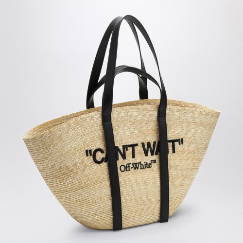 Medium tote by Off-White in natural-coloured raffia features a contrasting CAN’T WAIT print, black leather handles, a single compartment and an internal flat pocket.