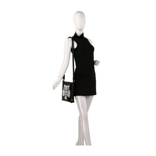 This fashion crossbody is made in a soft faux leather and features a rhinestone crafted owl design.