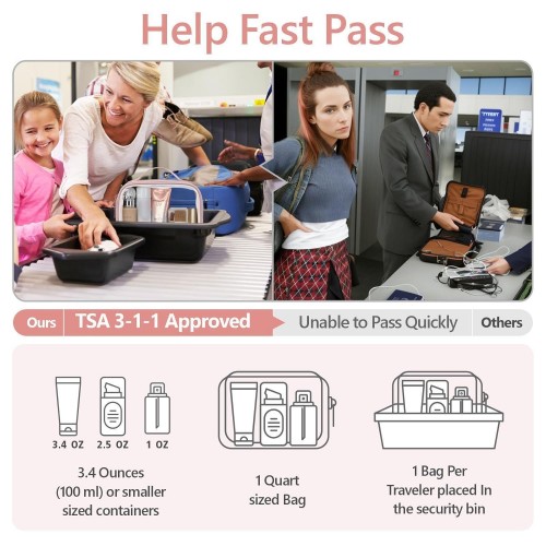 - TSA Approved, Meet Liquids Rule: The medium size clear makeup bag is 7.8 x 2.3 x 5.9 inch, it follows the TSA’s 3-1-1 Liquid Rule published by TSA. You can quickly pass the airport security screening. High-quality metal zipper is smooth not get stuck