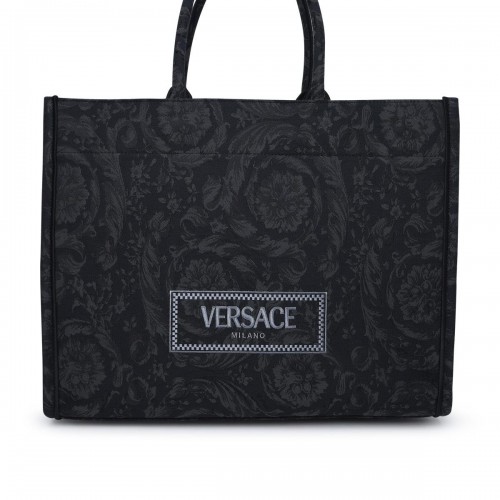 Leather handles with long woven string, logo embroidery on the front, inside pocketn40 x 27.5 x 13 cm
