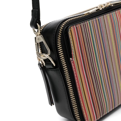 Black, calfskin, Icon striped design, round zip closure, flat handle and adjustable straps.
