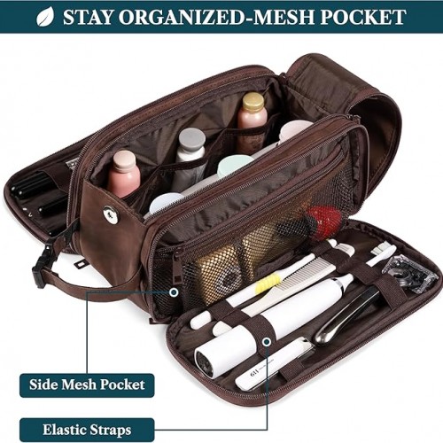 - MENS TOILETRY BAG: This functional PU leather toiletry travel bag has a large compartment and side pockets with additional pockets to hold all your toiletry, shaving, and grooming accessories. Equipped with elastic bands and additional mesh pockets to keep your hygiene items secured while traveling, weekend trip at hotel, or at home, this cosmetic make up case will help you stay organized.