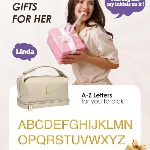 Personalized Friend Gifts, Initial Large Makeup Bag, Personalized Double Layer Cosmetic Bag with Makeup Brush Organizer, Waterproof, Large Capacity PU Leather Toiletry Bag,Teacher Gifts
