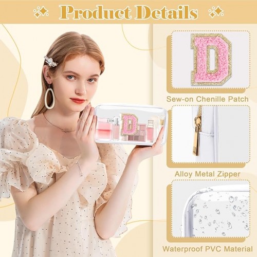 Personalized Initial Letter Clear Makeup Bag,Preppy Small Nylon&PVC Cosmetic Zipper Bag with Chenille Letter,Travel Skincare Toiletry Bag,Monogram Christmas Gift for Teen Girls Women,D