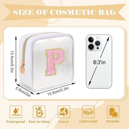 Personalized Initial Letter Clear Preppy Makeup Bag,Mini Nylon Chenille Letter Cosmetic Bag Cute Zipper Pouch Purse for Teen Girls,Portable TSA Approved Beach Travel Essentials Bag Gift for Women,P