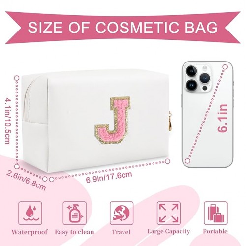 Personalized Makeup Bag Initial A-Z Preppy Patch Bag,Small PU Leather Travel Cosmetic Bag Pouch with Zipper,White Cute Toiletry Bag,Gift Ideal for Teen Girls Women Birthday Friend Mom,Letter J