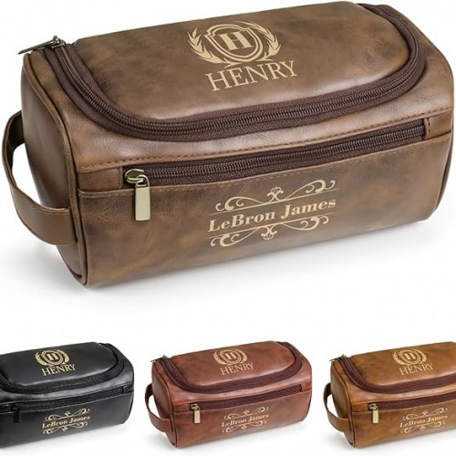 Personalized Toiletry Bag for Men, Custom Leather Shaving Dopp Kit for Him, Engraved Name Initials Travel Bag for Husband, Personalized Christmas Birthday Gifts for Men Dad Groomsmen-Tan