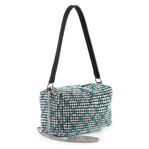 Simple and elegant, this shoulder bag is covered with square stones and features a removable chain strap.