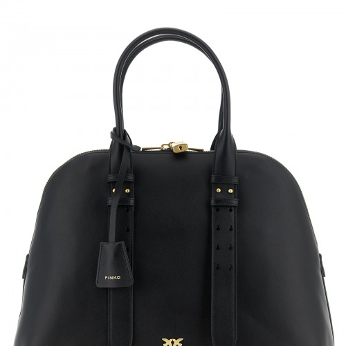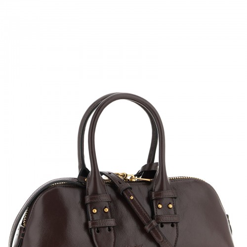 Small ‘Escape Baguette’ bowling handbag with varnished effect, metal ‘Love Birds’ logo on the front and embroidered back, double adjustable handle, top zip closure with padlock detail, rigid base with metal feet, cotton lining, removable charm, adjustable and removable shoulder strap.