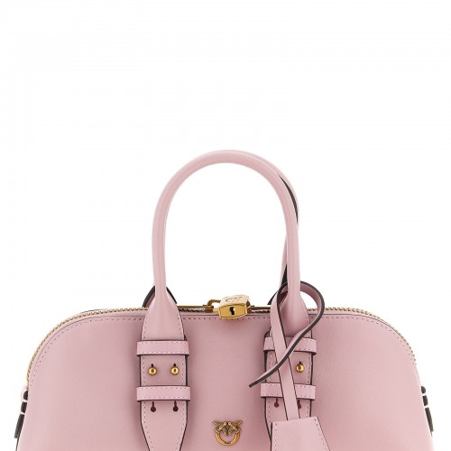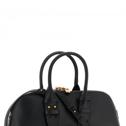 Small ‘Escape Baguette’ bowling handbag in leather with metal ‘Love Birds’ logo on the front and embroidered on the back, double adjustable handle, top zip closure with padlock detail, rigid base with metal feet, cotton lining, removable charm, adjustable and removable shoulder strap.