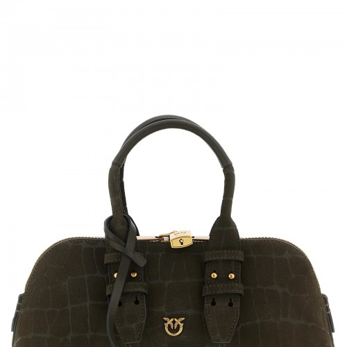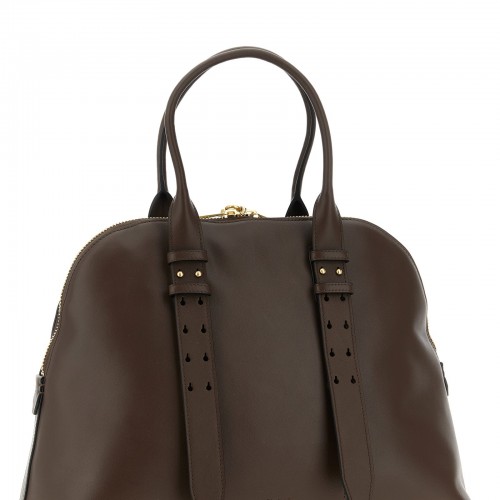 ‘Escape’ maxi leather bowling handbag with metal ‘Love Birds’ logo on the front and embroidered back, double adjustable handle, top zip closure with padlock detail, rigid base with metal feet, cotton lining. adjustable and removable shoulder strap.