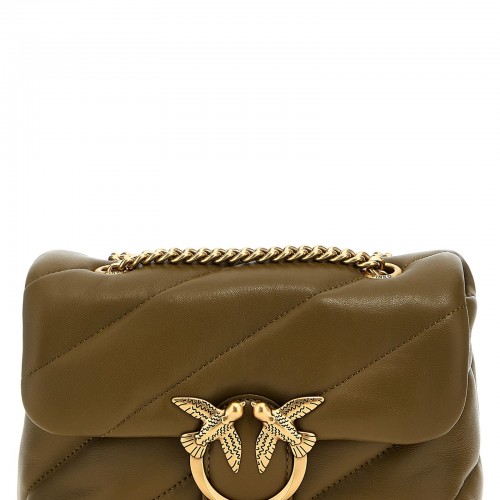 Love big puff’ matelassé leather crossbody bag with metal hardware, a flap closure with logo.