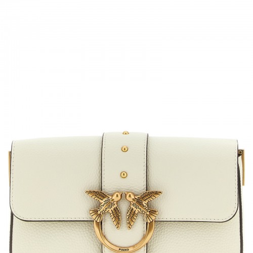 ‘Love One Slouchy Baby’ fabric crossbody bag covered with rhinestones forming the monogram pattern, magnetic flap closure with metal ‘Love Birds’ logo on the front, adjustable and removable chain and leather shoulder strap.