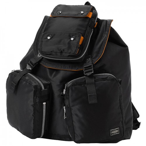 It is available in three colors: black, sage green, and iron blue, with a vivid rescue orange on the reverse side. In addition, hardware such as aluminum zippers, snap buttons, and nacelles, which were rare at the time of its release, are made to peel off the paint on purpose so that they will change over time as the bag is used.