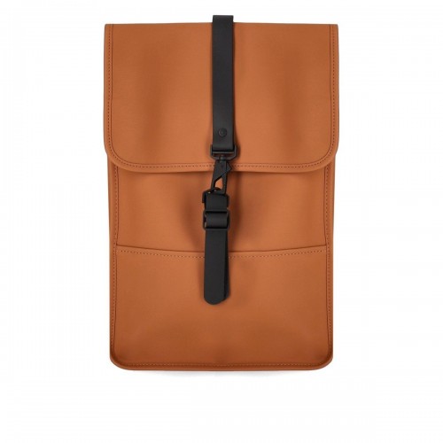 Backpack made of waterproof PU in rust color by Rains, featuring a rolltop closure with a carabiner and a front pocket with a zipper. Lined interior, expandable via side buttons. Padded back and adjustable shoulder straps with a buckle strap. Dimensions 48x32x11 cm.
