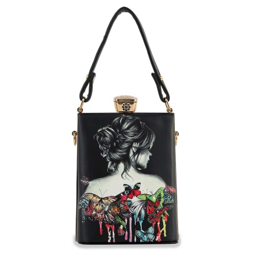 An Art Deco inspired print dazzles against the metal frame exterior of a petite hand tote fitted with a crossbody chain for hands free styling.