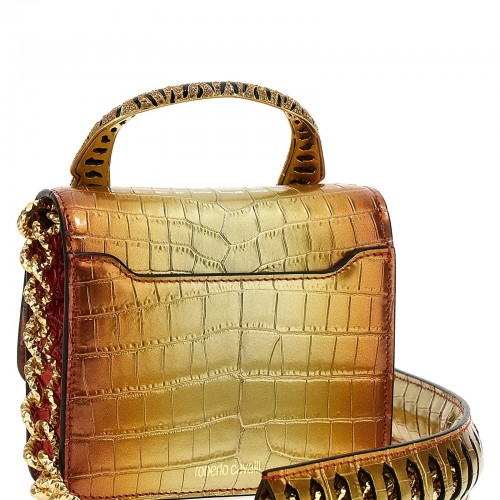 ‘Roar’ small handbag in croc print leather, magnetic flap closure, jewel tiger handle, chain handle with removable leather shoulder pad.