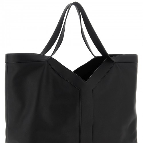 Large shopping bag in finely hammered leather, tone-on-tone suede lining, front and back insert to create a ‘Y’, double fixed handle, inner closure with snap hook.
