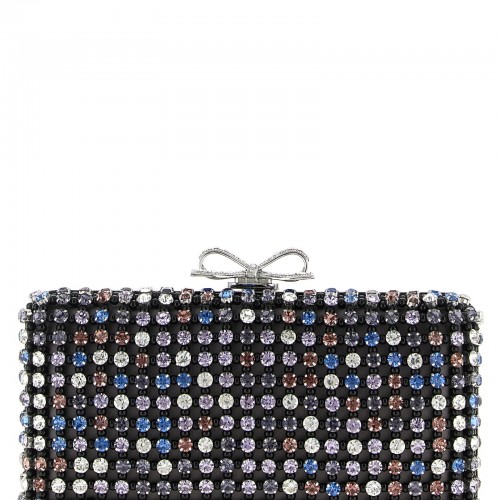 Black Satin Floral Crystal’ satin clutch with front floral embroidery in beads and crystals, interlocking closure with top jewel bow application, removable chain shoulder strap.