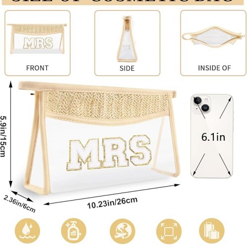 Small Boho Straw Clear Mrs Makeup Bags for Women&Girls, Zipper Cosmetic Bag Chenille Varsity Letter Patch Bag, Preppy Cute Toiletry Pouch, Trendy Organizer Storage Bag for Beach Travel Essentials