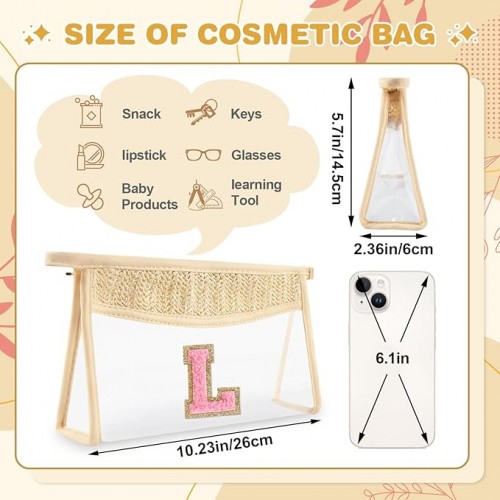 Small Boho Straw Initial Letter Makeup Bag Personalized Gift ,Cute Clear Chenille Patch Makeup Bag With Zipper,Trendy TSA Approved Travel Toiletry Bag,Gift for Women Girls Birthday Friend, Letter L