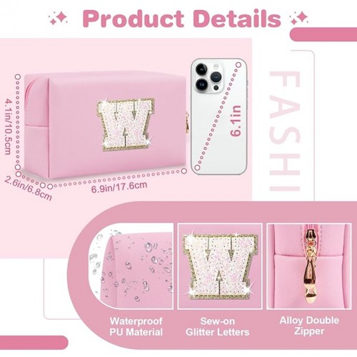 Small Personalized Initial A-Z Patch Makeup Bag,Pink Cute PU Leather Glitter Letter Cosmetic Bag for Teen Girls,Travel Toiletry Bag with Zipper,Preppy Monogrammed Birthday Gift for Daughter Niece W