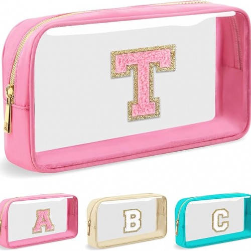 Small Personalized Initial A-Z Preppy Patch Makeup Bag,PU Chenille Letter Travel Cosmetic Pouch with Zipper,Blue Cute Toiletry Bag,Gift Ideal for Teen Girls Women Teacher Bridesmaid,Letter C