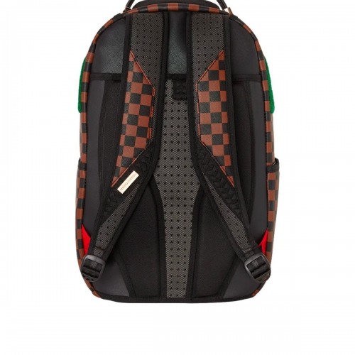 Chenille Sip backpack by Sprayground made of faux leather with brown and black checkered pattern, decorated with a chenille shark mouth, the brand’s symbol, applied in contrast on the front. Details in golden metal, interior with multiple compartments, including a dedicated velvet laptop pocket, top handle and zip closure. Side pockets with velcro. Adjustable shoulder straps and padded ergonomic back, with an opening to hook it onto the trolley handle. Measures 46x30x16.5 cm.
