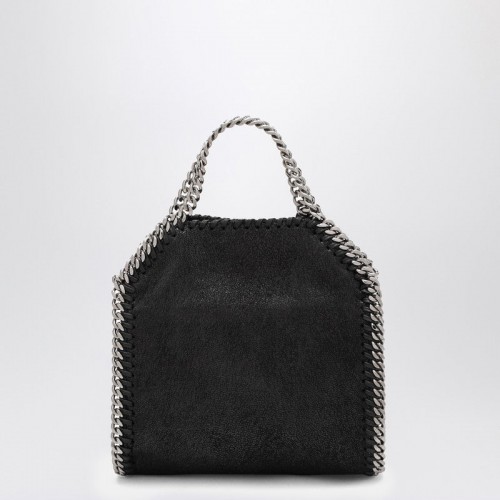 Black faux leather micro tote bag from Stella McCartney. Featuring chain trim, silver-tone metal hardware, a magnetic button closure and an internal flat pocket.