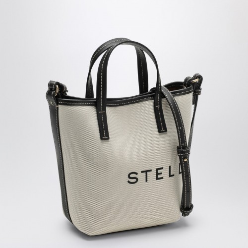 Recycled cotton-blend canvas tote bag by Stella McCartney in écru colour, featuring two top handles, an adjustable and removable shoulder strap, contrasting faux leather detailing, contrasting lettering logo, an internal flat pocket and snap button closure.
