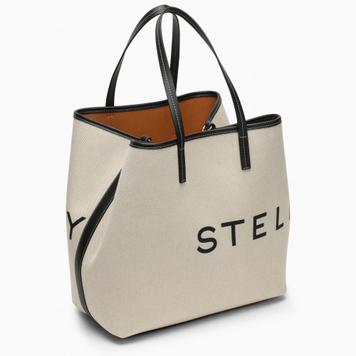 Ecru-coloured cotton-blend tote bag by Stella McCrtney featuring two leather top handles, contrasting lettering logo and removable inner pocket with snap button.