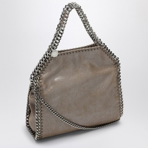 Shiny beige faux leather tote bag from Stella McCartney featuring a silver-tone chain shoulder strap detail, a light silver-tone chain trim, and an internal compartment with a pouch pocket.