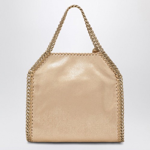 Stella McCartney crossbody bag in light gold metallic faux leather featuring thick gold chain strap, light chain trim and interior compartment with slip pocket.