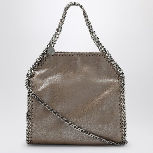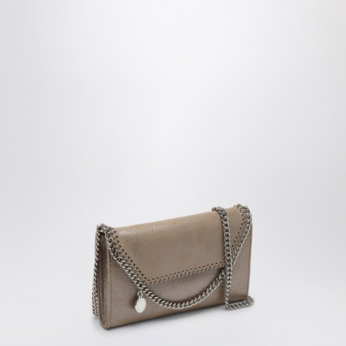 Beige faux leather wallet bag from Stella McCartney featuring a chain shoulder strap, a flap and magnetic button fastening, an internal flat pocket and silver-tone metal hardware.