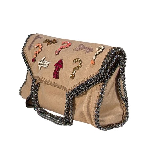 Make a country western statement with the Stella McCartney beige faux suede Falabella bag. This “it girl” gear features a unique combination of multicolor jeweled designs that add a touch of glamour to the soft tan faux suede material. Perfect for any occasion, this bag is a must-have for any fashion-forward individual.