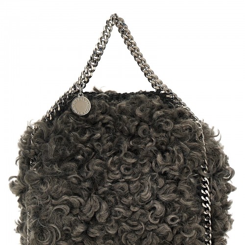 ‘Falabella Tiny’ handbag in eco shaggy deer fabric with magnetic closure, double chain handle, long chain shoulder strap.