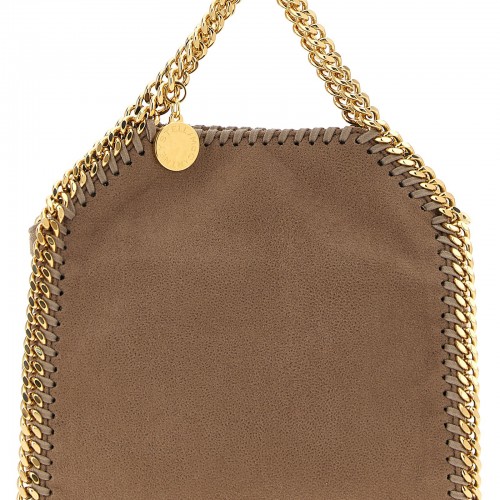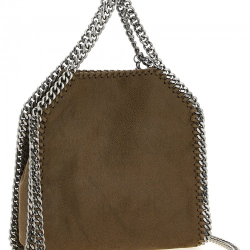 ‘Tiny Falabella’ handbag in Shaggy Deer vegan fabric with semi-gloss finish, silver chain, double fixed handle, magnetic closure, chain shoulder strap, medallion charm with engraved logo.