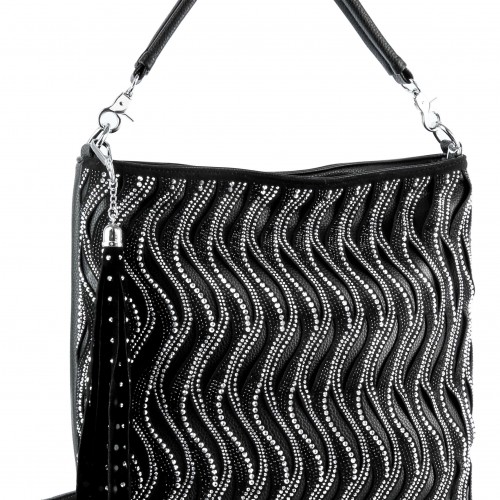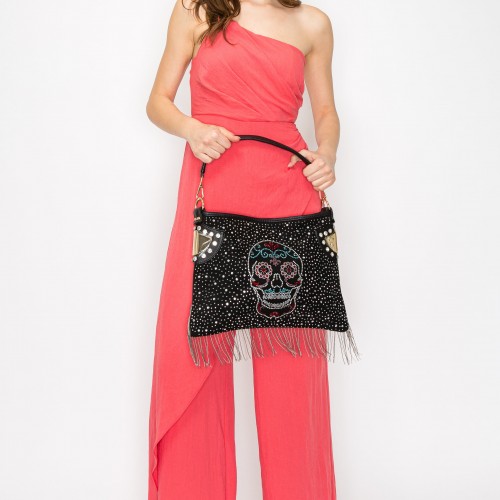 A rhinestone sugar skull gives instant wow-factor to a faux leather hobo bag designed with an effortlessly hip silhouette.