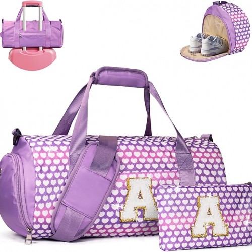 Teenager Girl Gift Ideas, Girls Travel Duffel Bag, Kids Initial Overnight Bags with Shoe Compartment, Customized Sport Gym Weekender Bag with Makeup Pouch, Preppy Stuff (Letter F)