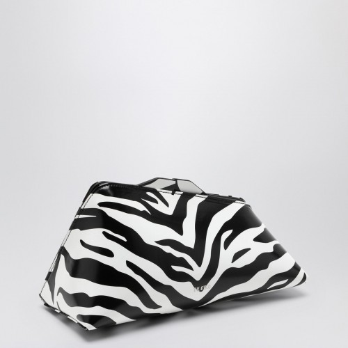 Black and white zebra-patterned leather clutch from The Attico featuring a magnetic closure, an internal flat pocket, metal feet and a printed logo on the front.