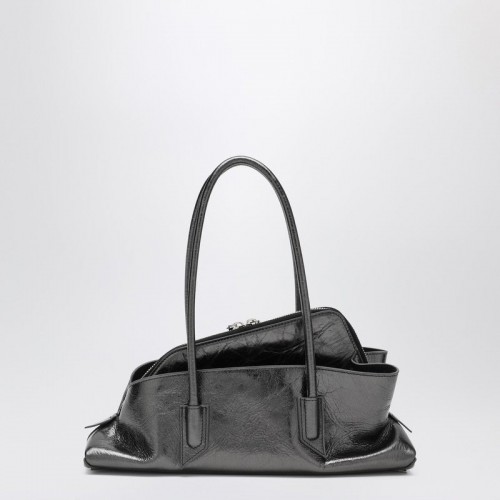 The Attico small bag in dark grey laminated leather, characterized by two long tubular handles, two open compartments, one compartment with a double zip closure, one internal flat pocket, asymmetric design, metal feet, embossed logo lettering on the front, and silver-coloured metal hardware.